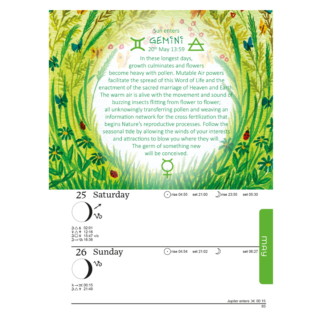 This beautifully designed, full colour, clear and concise Moon Diary is absolutely packed with all the lunar and astrological information for 2024. Suitable for those just interested in the Moon and her cycle as well as professional astrologers. The diary celebrates the eight fire festivals throughout the year observing nature through the seasons. Its innovative astrological forecasts and wealth of astronomical information makes this diary perfect for anyone wanting to live in harmony with the rhythms and cycles of Nature. An educational and informative treasure trove.